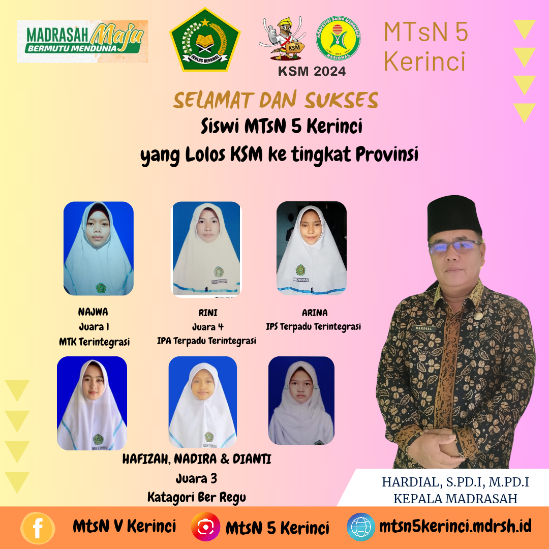 Salah satu juara yang namanya terpilih mewakili kabupten adalah Najwa Angraini, siswi dari MTsN 5 Kerinci yang berhasil menunjukkan keunggulannya dalam kompetisi ini. Dengan bimbingan dari guru dan dukungan dari sekolah, Najwa Angraini mampu menembus berbagai tahapan seleksi hingga akhirnya meraih juara tingkat kabupaten. Keberhasilan ini tidak hanya mengukir namanya dalam sejarah sekolah, tetapi juga menjadi inspirasi bagi rekan-rekannya.