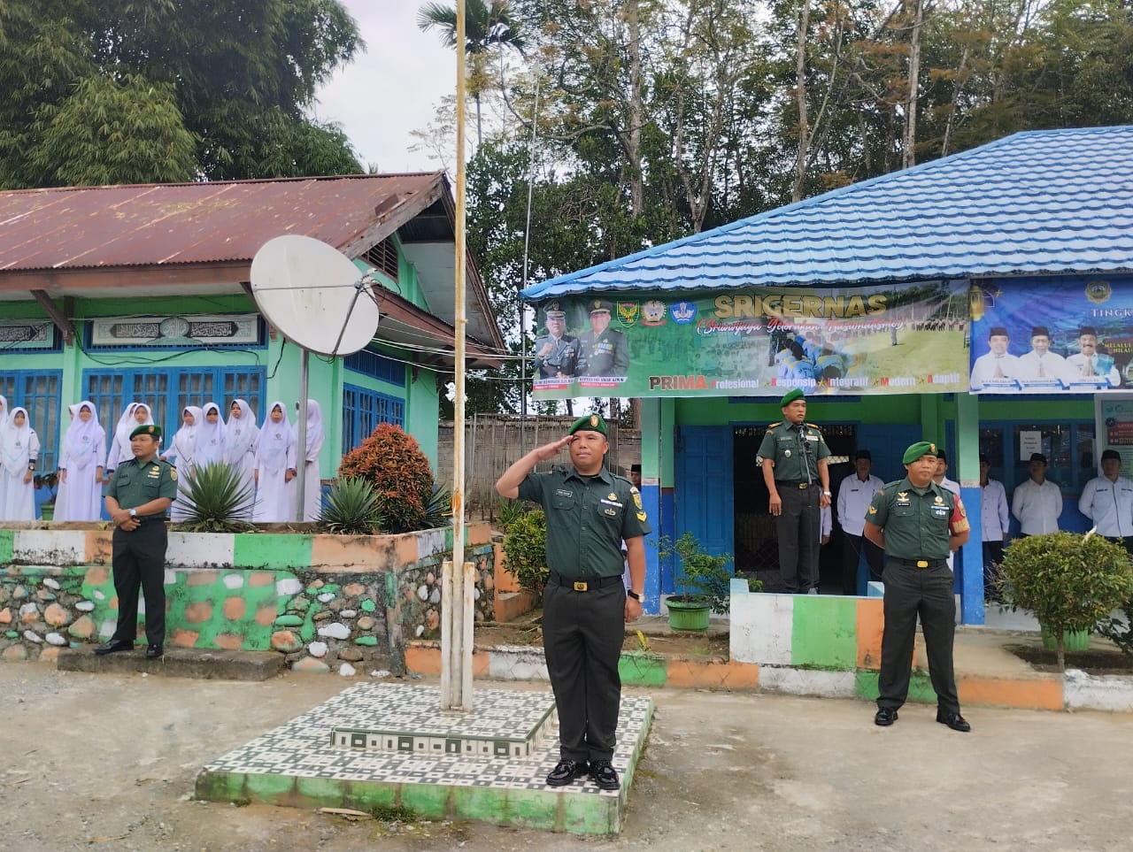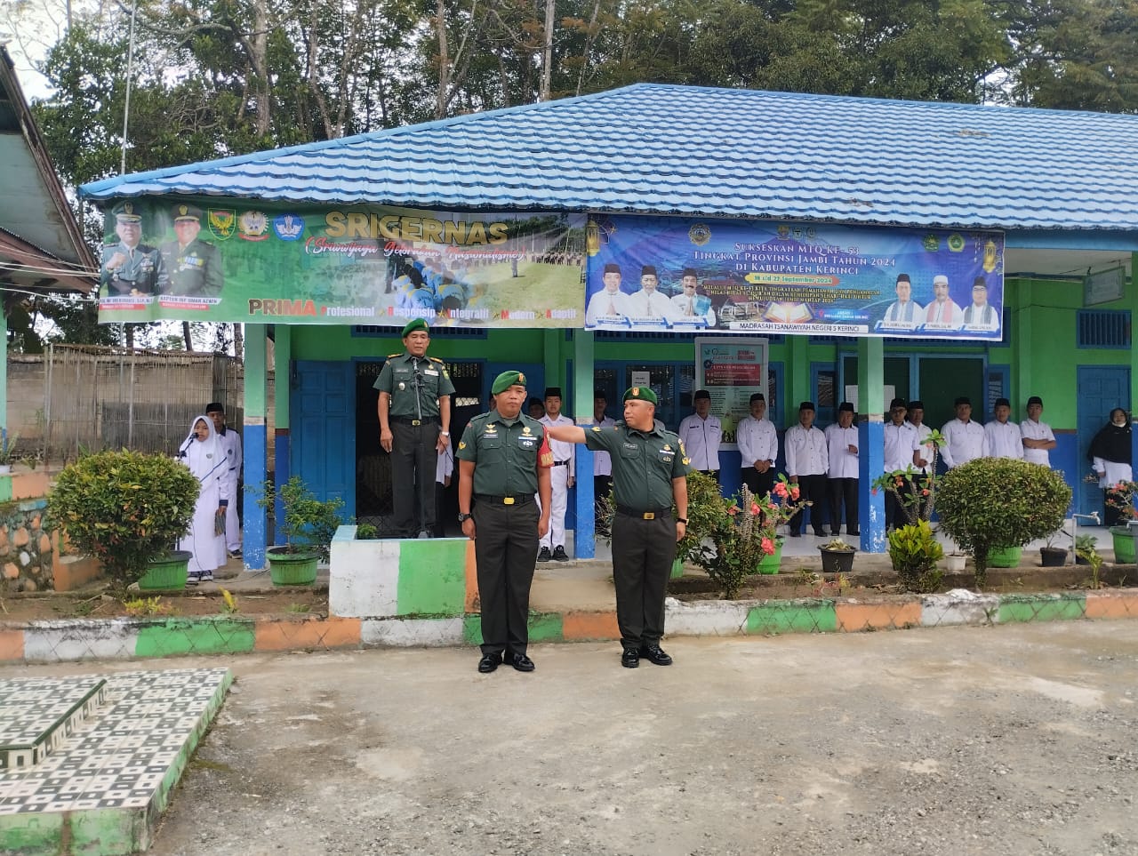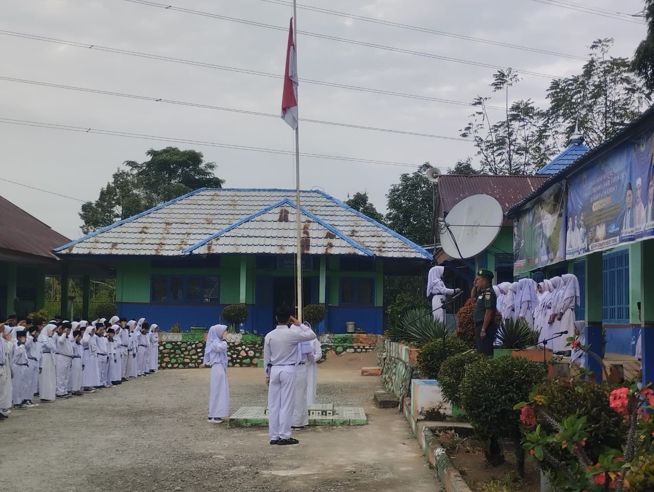 Kerinci - Suasana pagi di MTs 5 Kerinci tampak berbeda dari biasanya. Pada hari Senin (03/02), halaman sekolah dipenuhi oleh siswa-siswi yang berbaris rapi, siap mengikuti upacara bendera. Namun, ada yang istimewa pada upacara kali ini. Hadir di tengah-tengah mereka, Komandan Koramil (Danramil) Kapten Umar Azwir. bersama anggota: Peltu Amni Parlin, Sertu Didi Iskandar dan Sertu Emil Salim yang turut serta hadir dalam rangka silaturahmi dan menyampaikan amanat dari Dandim Letkol Inf Eko Budiarto, S.I.P., M.I.P Misi dalam menanamkan Jiwa Nasionalisme Cinta Tanah Air dan Kedisiplinan baik dalam berbuat maupun bertindak.