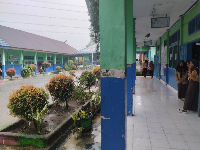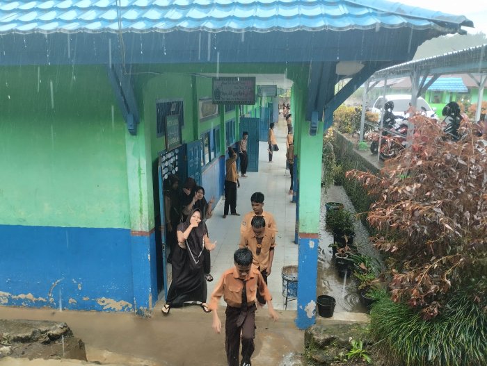 KERINCI [08/01] Suasana di Madrasah Tsanawiyah Negeri (MTsN) 5 Kerinci tampak berbeda pada siang hari ini. Hujan deras yang mengguyur wilayah Kabupaten Kerinci sejak pagi tadi membawa perubahan suhu yang signifikan, mengubah teriknya matahari menjadi hembusan angin yang sejuk dan menenangkan di seluruh lingkungan madrasah.
