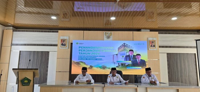 KERINCI – [03/03] Dalam upaya memperkuat tata kelola lembaga pendidikan yang transparan dan bertanggung jawab, Kepala Madrasah, Dafri Hayani, secara resmi melaksanakan penandatanganan Perjanjian Kinerja (Perkin). Prosesi penting ini dilangsungkan di Aula Kantor Kementerian Agama Kabupaten Kerinci dengan dihadiri oleh jajaran pejabat struktural dan para kepala madrasah lainnya.