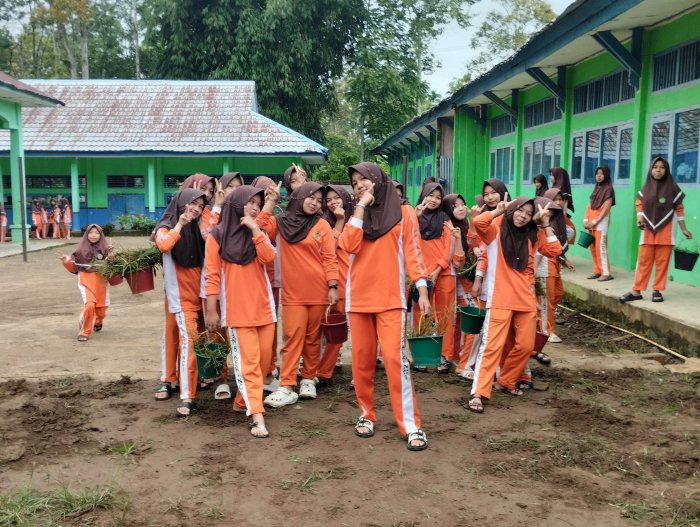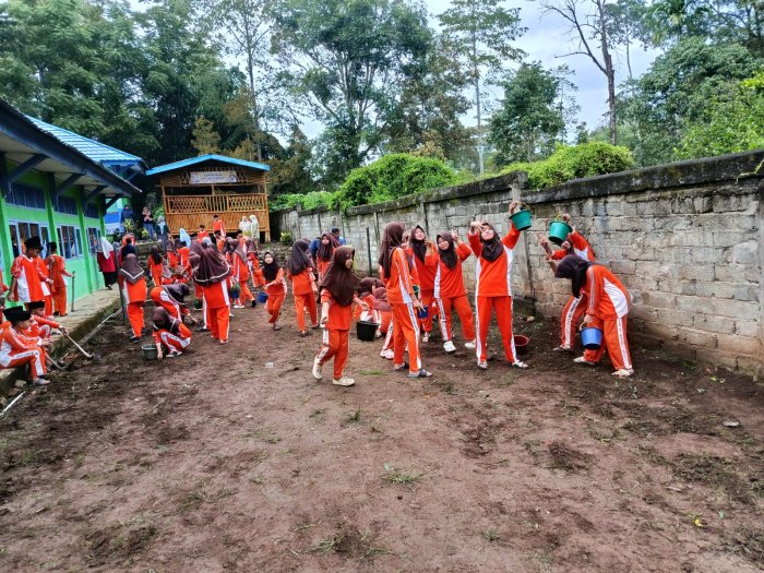 Pantauan di lokasi menunjukkan antusiasme yang tinggi dari para siswa. Dengan membawa peralatan kebersihan dari rumah seperti sapu lidi, cangkul, mereka bahu-membahu membersihkan area yang telah ditentukan. Gelak tawa sesekali pecah, menunjukkan bahwa semangat kebersamaan tetap terjaga meskipun harus bekerja di bawah terik matahari pagi.