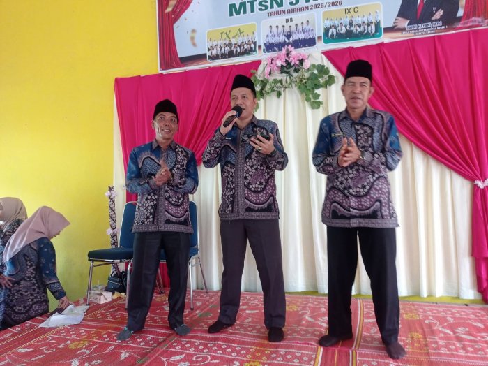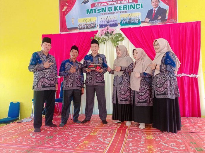 KERINCI – Di tengah suasana haru prosesi perpisahan siswa kelas IX, sebuah kejutan manis hadir menghangatkan suasana di MTsN 5 Kerinci. Secara tidak terduga, rangkaian acara formal sejenak berganti menjadi momen penuh keceriaan saat seluruh majelis guru, staf Tata Usaha, dan perwakilan siswa memberikan kejutan ulang tahun kepada Kepala Madrasah. Momen ini menjadi bukti kedekatan dan kekeluargaan yang erat di lingkungan madrasah.