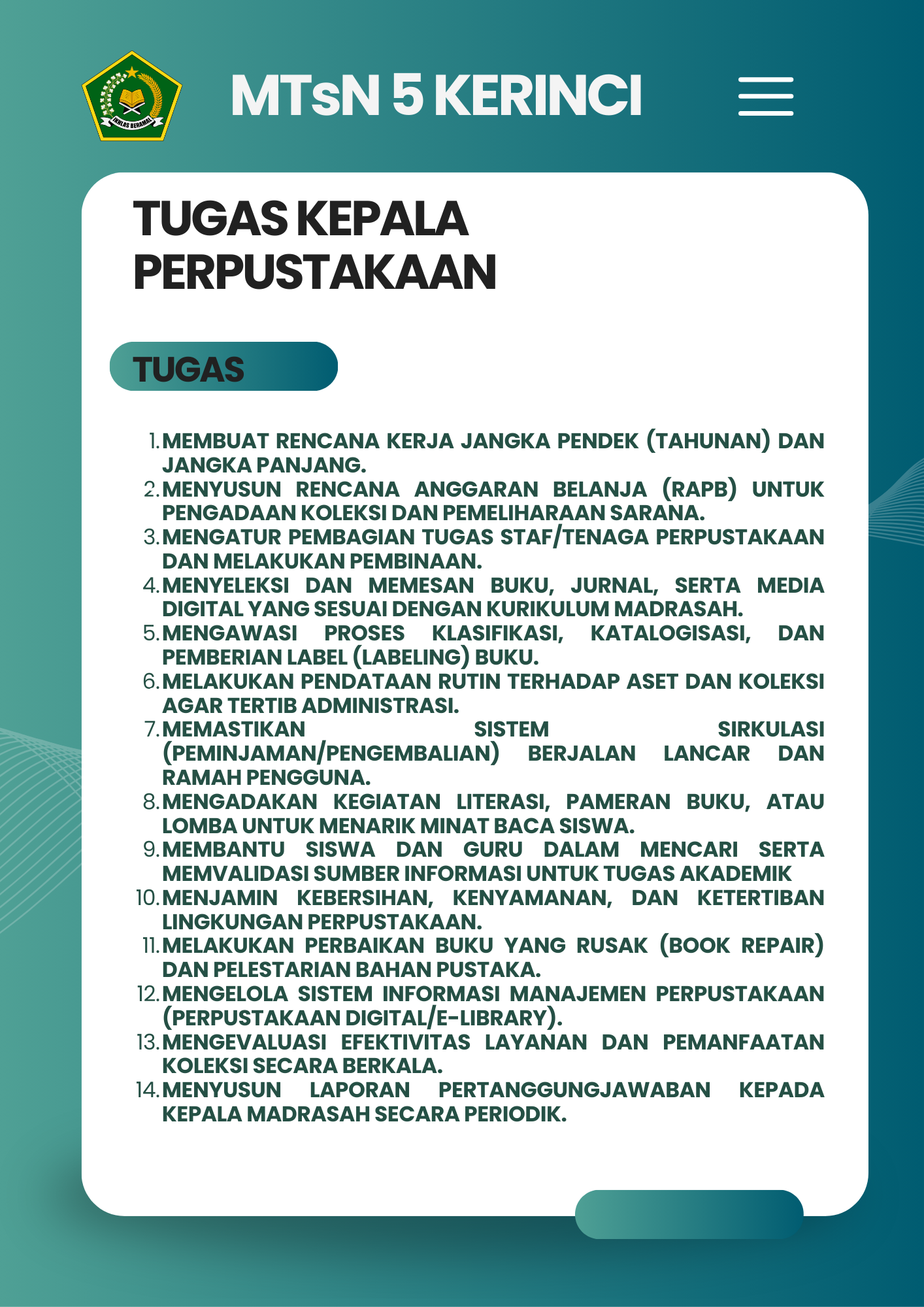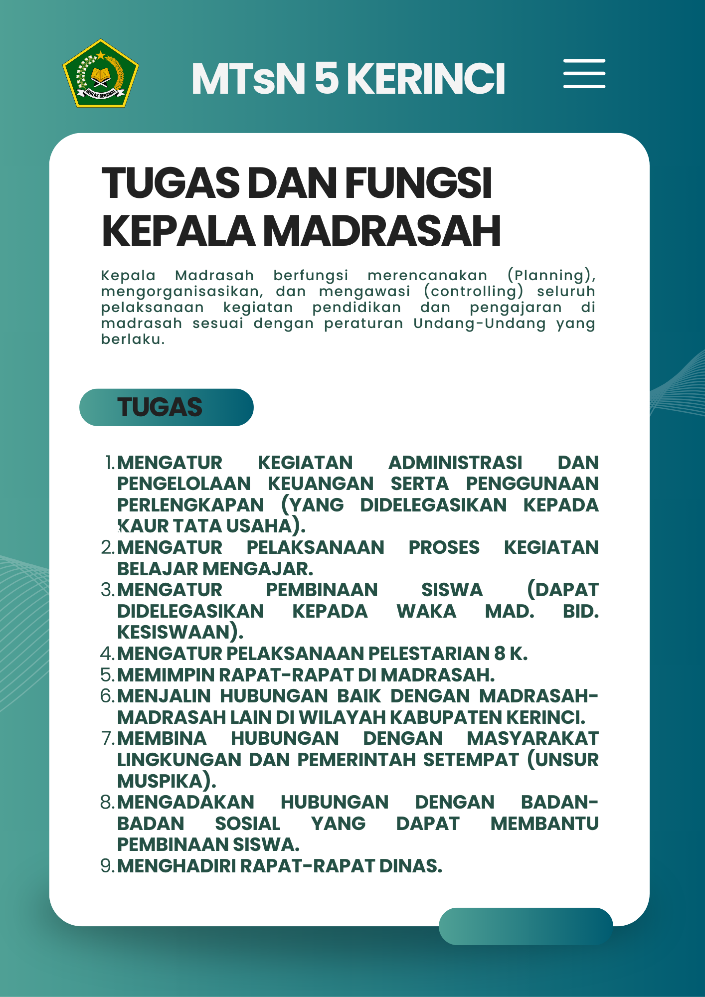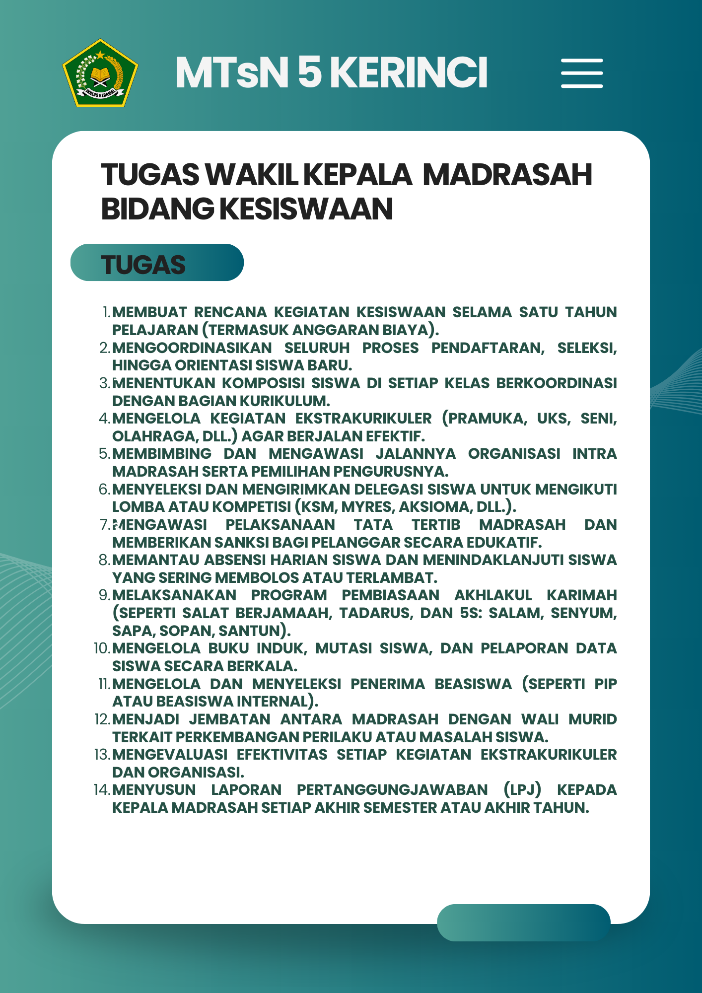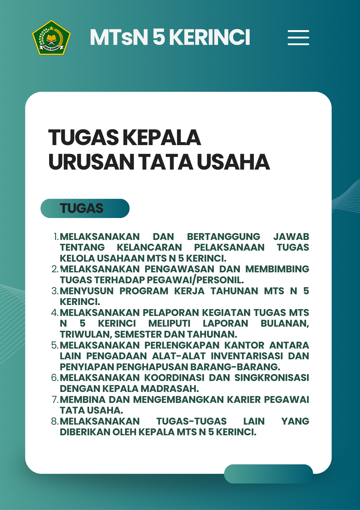 Selamat Datang di Website Resmi MTSN 5 Kerinci # Selamat datang di website resmi MTs N 5 Kerinci || Jalan Bukit Tiung, Desa Penawar Tinggi, Kec. Sitinjau Laut, Kab. Kerinci, Jambi, 37171 ||