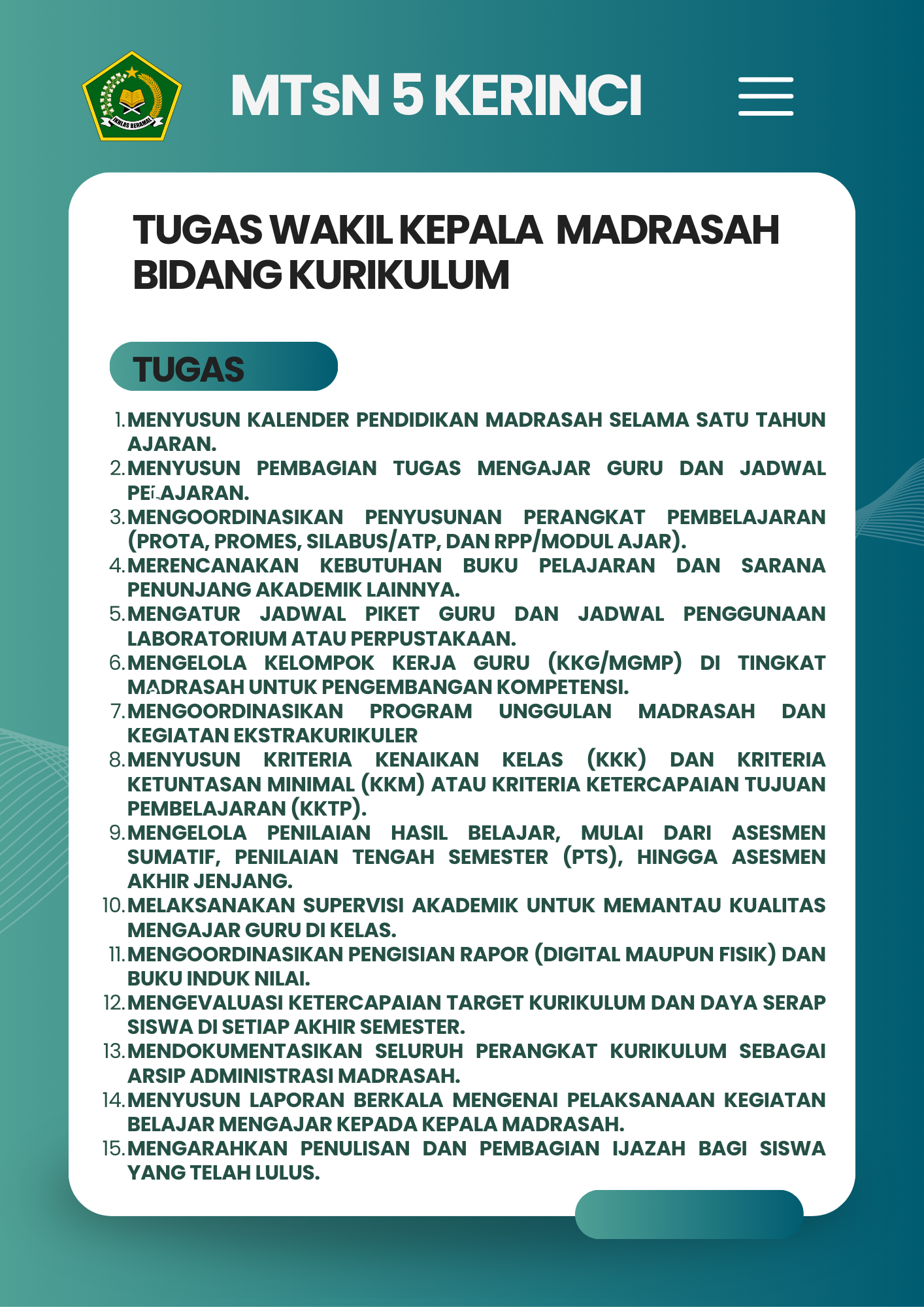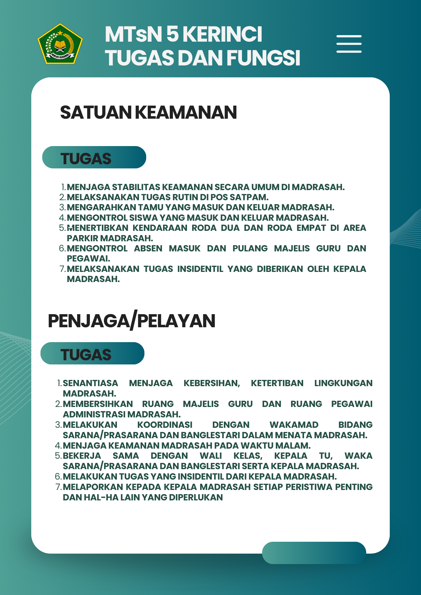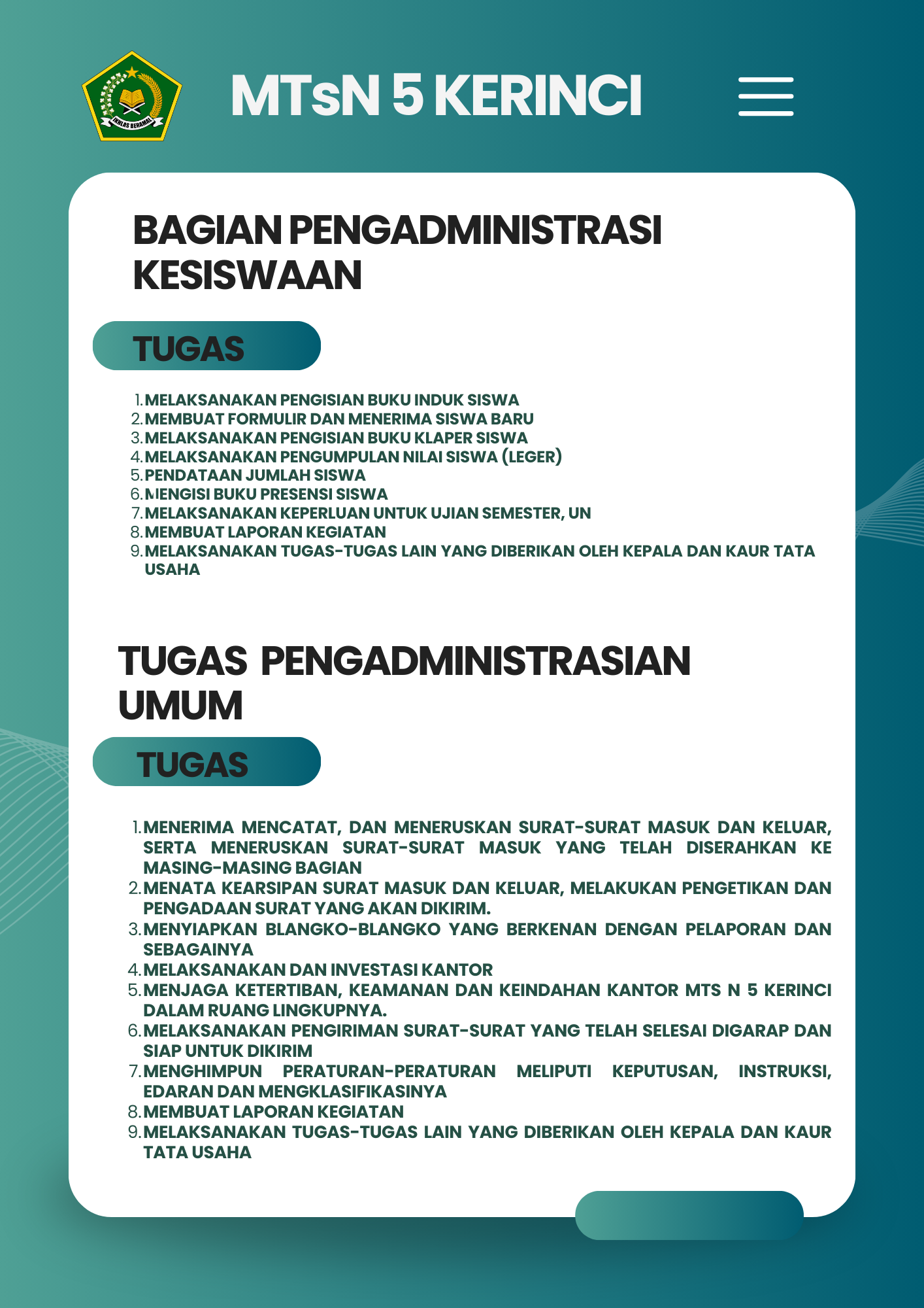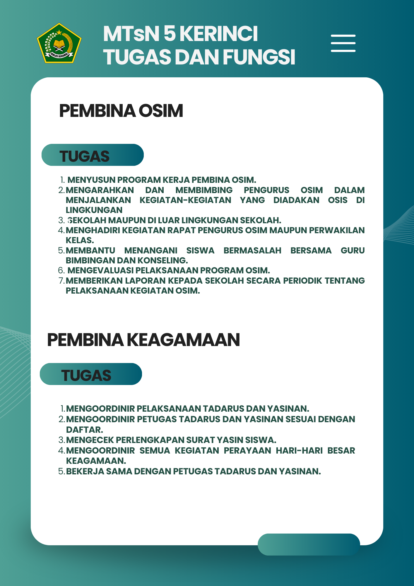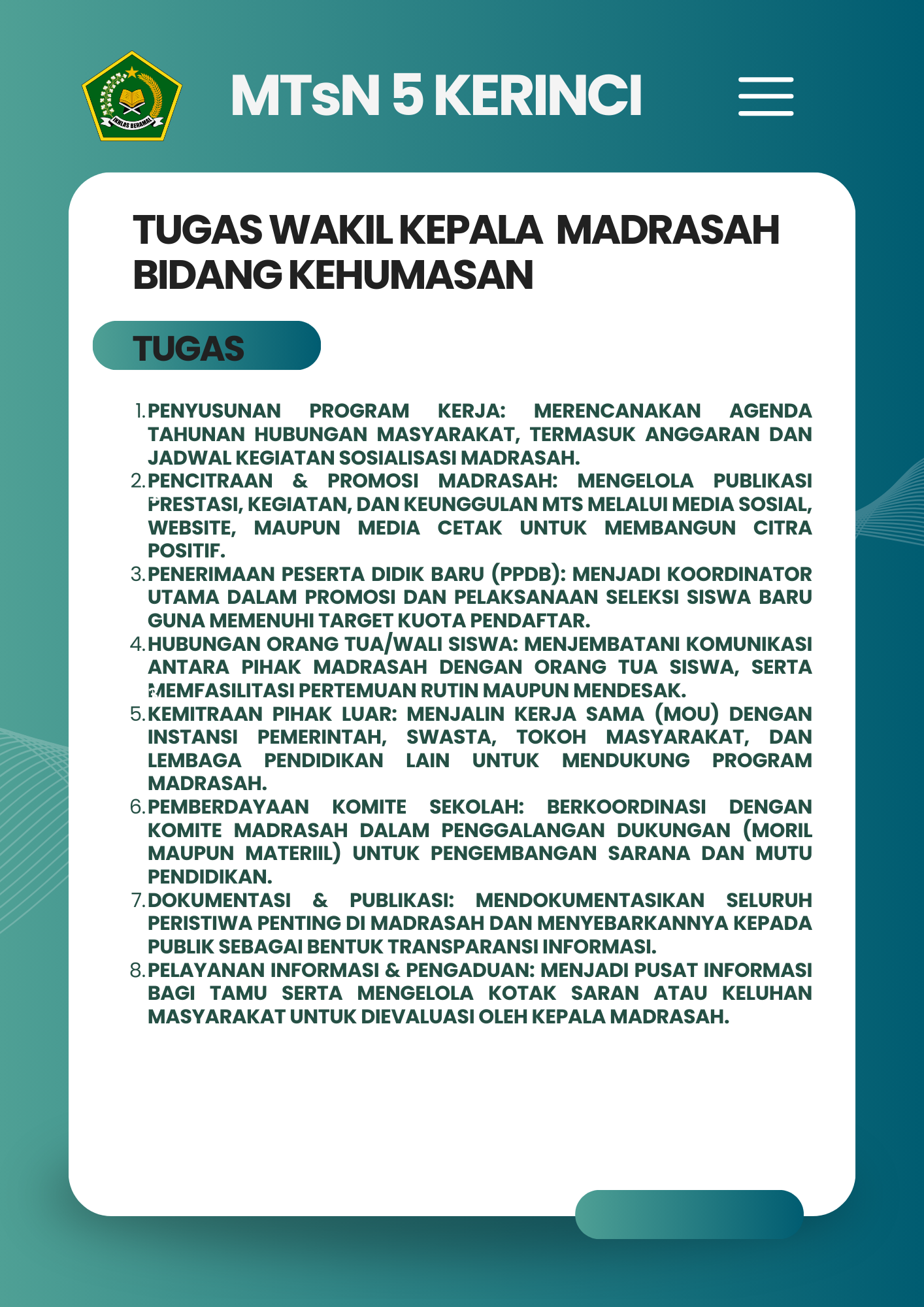 Selamat Datang di Website Resmi MTSN 5 Kerinci # Selamat datang di website resmi MTs N 5 Kerinci || Jalan Bukit Tiung, Desa Penawar Tinggi, Kec. Sitinjau Laut, Kab. Kerinci, Jambi, 37171 ||