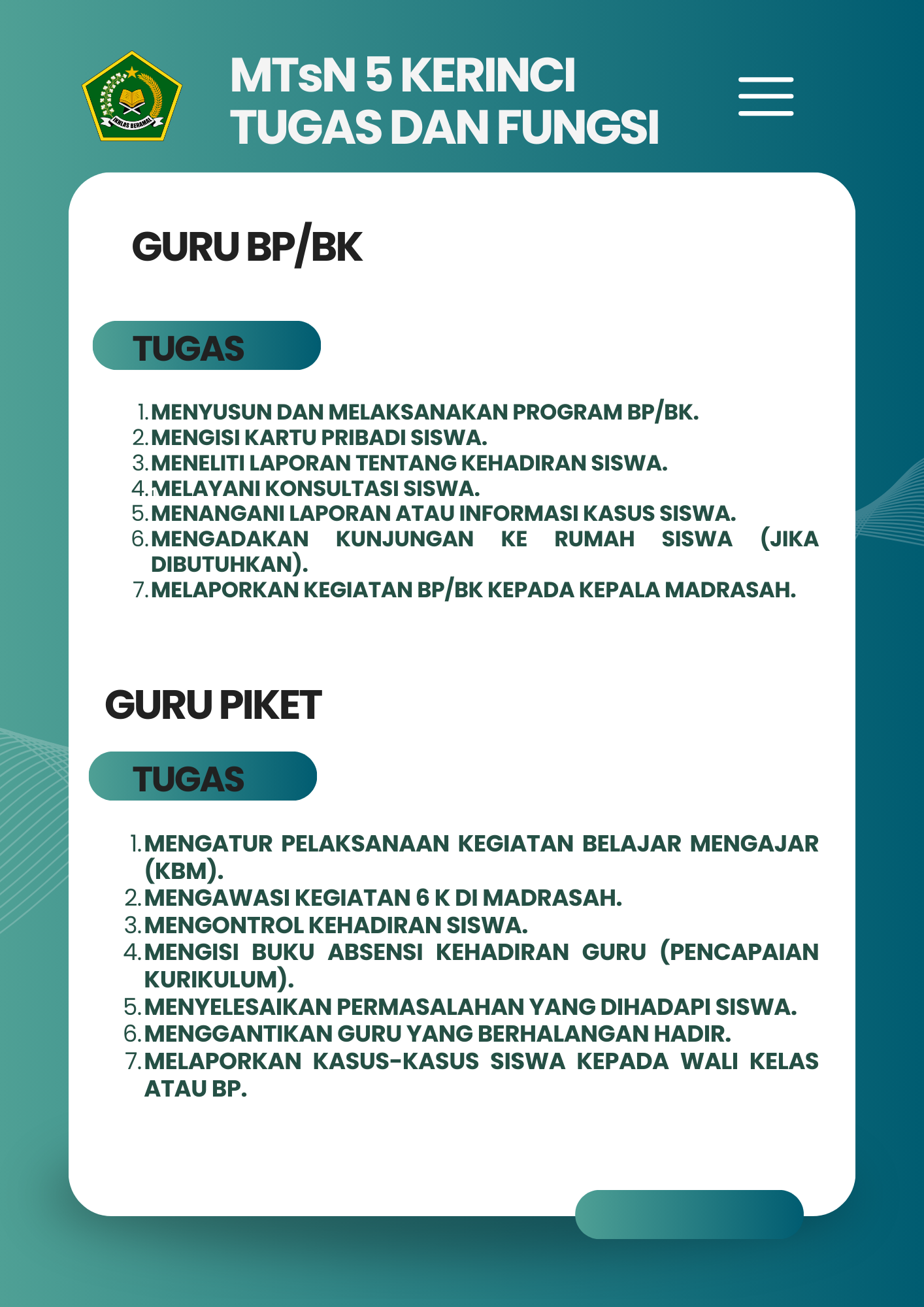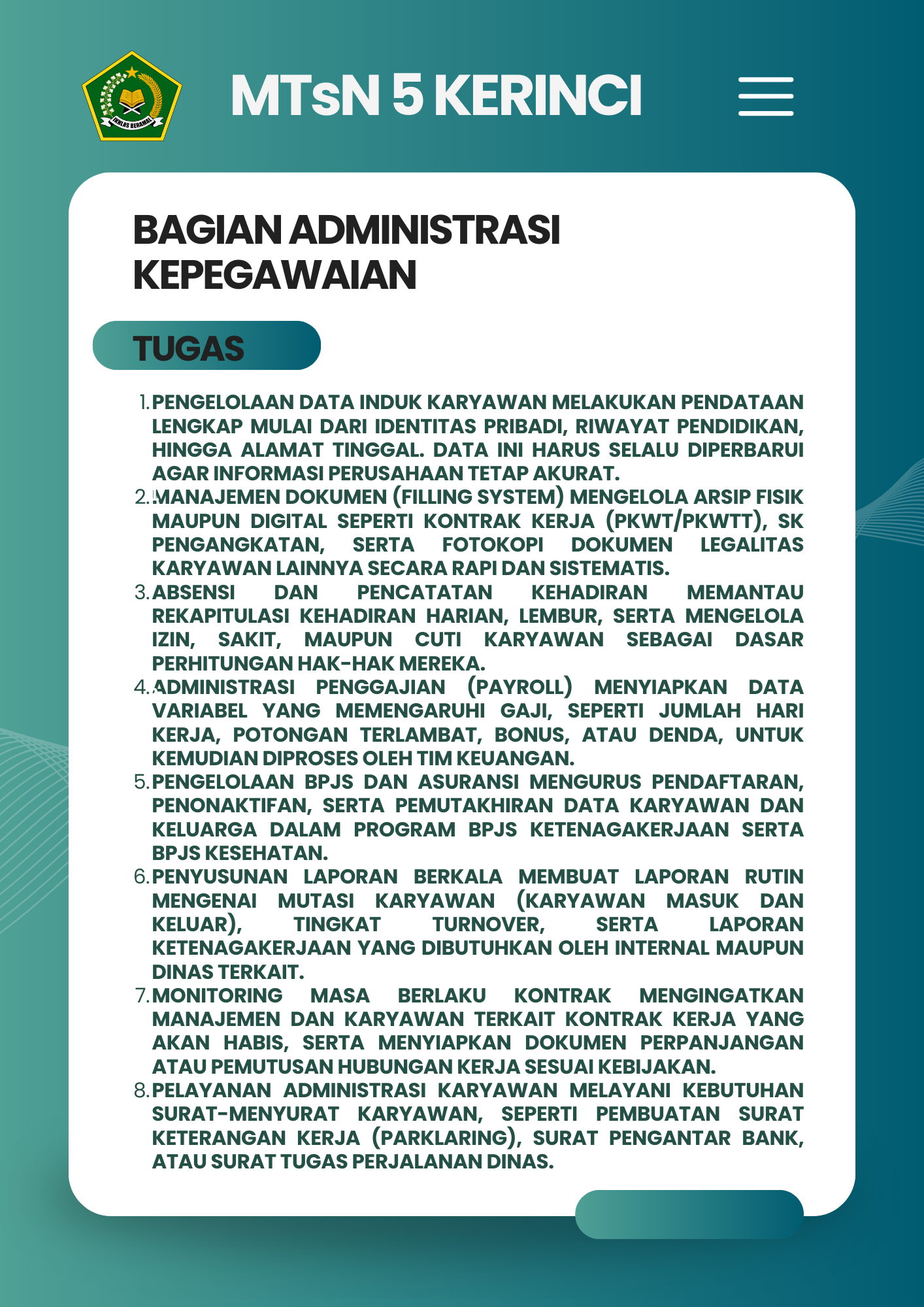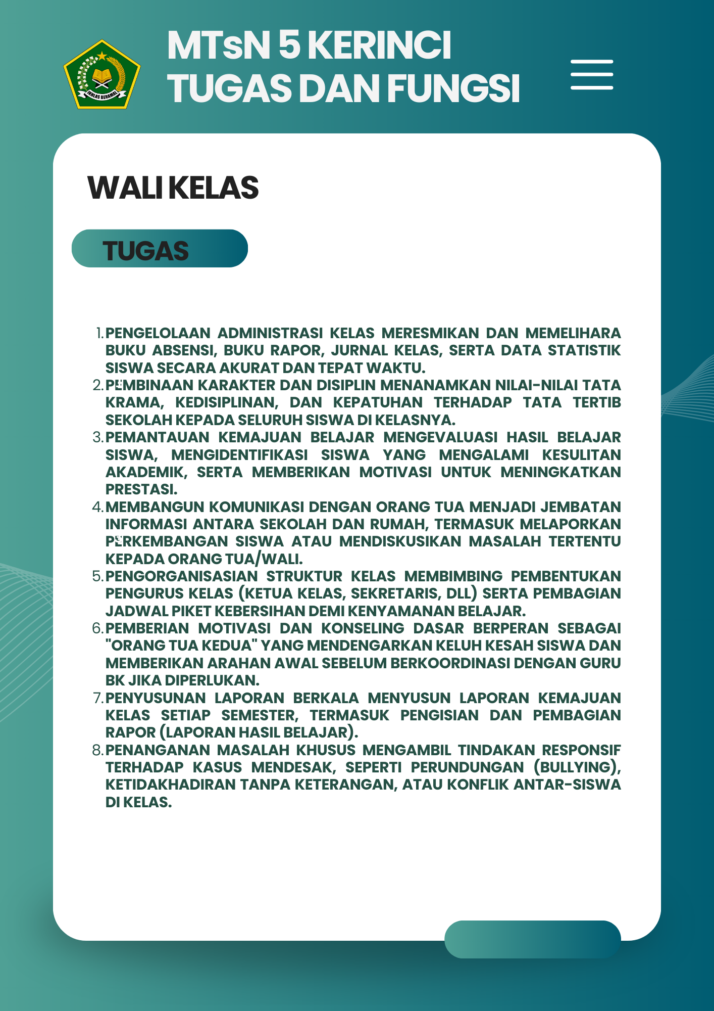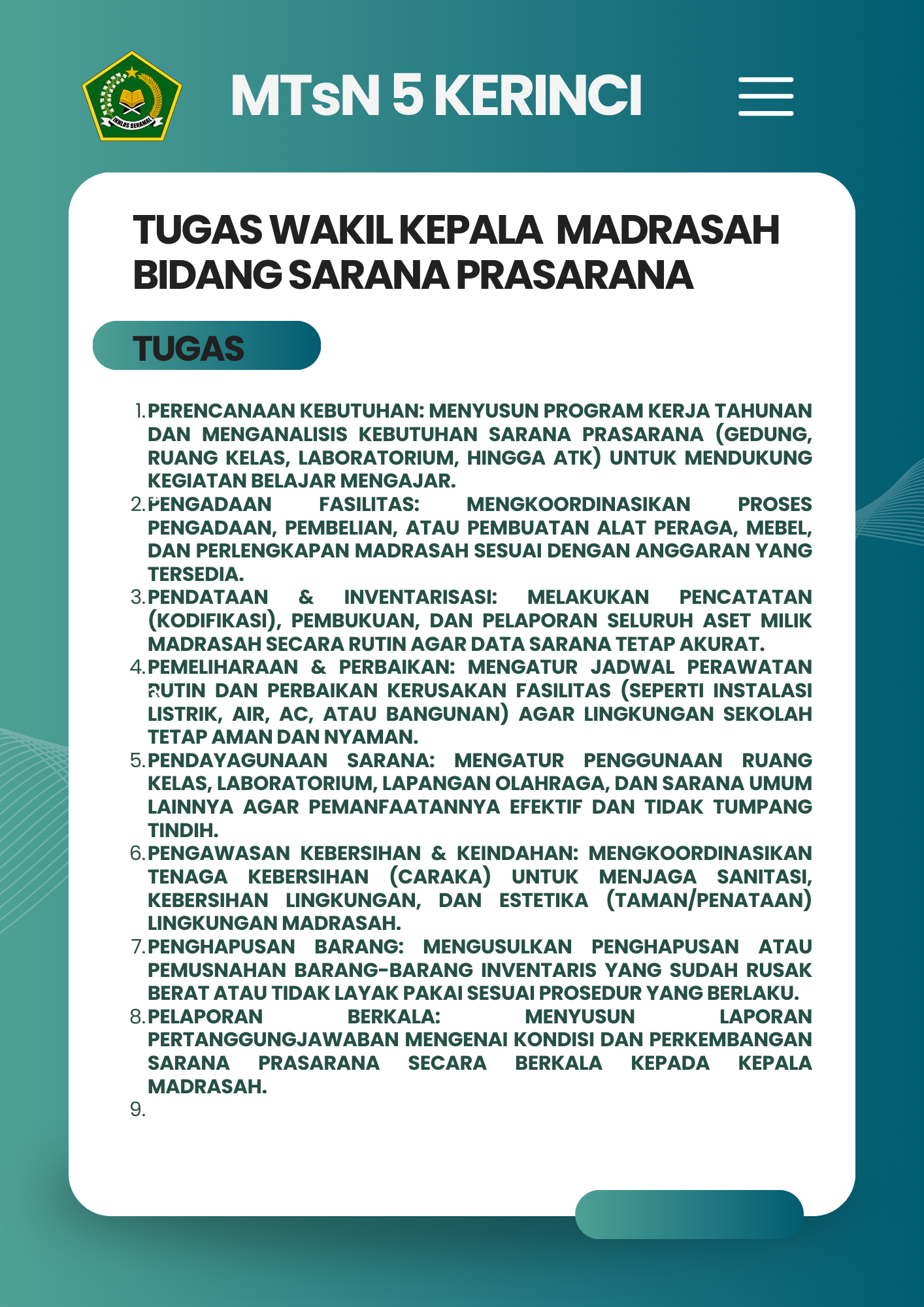 Selamat Datang di Website Resmi MTSN 5 Kerinci # Selamat datang di website resmi MTs N 5 Kerinci || Jalan Bukit Tiung, Desa Penawar Tinggi, Kec. Sitinjau Laut, Kab. Kerinci, Jambi, 37171 ||